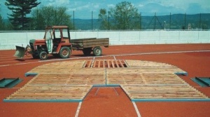 Rošt - kovo - dřevo pojízdný - Rošt prodlužuje životnost doskočiště, zamezuje přístupu vlhkosti od země. Základní tři typy jsou A rošt kovo dřevo - kovový rám s dřevě- ným roštem. B celodřevěný rošt. C Duck board - polyetylénové trámce jsou pevně spojeny se spodní stranou doskočiště. CENA JE UVEDENA ZA 1m2.